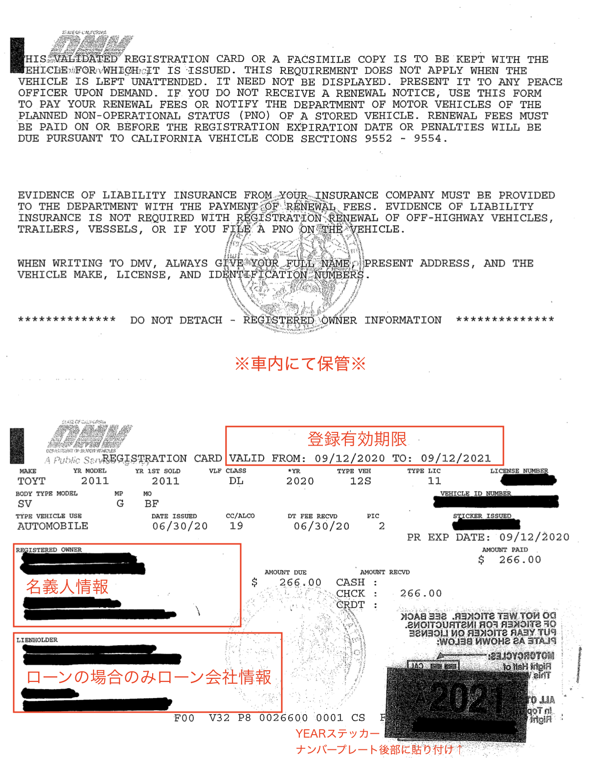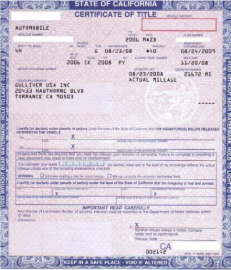 Certificate of Title(カリフォルニア州では通称ピンクスリップと呼ぶ)とRegistration Cardが郵送されます。