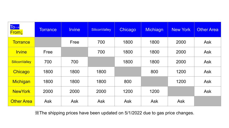 輸送費用は以下のチャートをご参照ください。金額表は時期によって変更することがございます。また、輸送にかかる期間はおおよその日程ではお伝えはできますが、業者の都合や道中の状況に左右されるため確約はできませんので予めご了承ください。